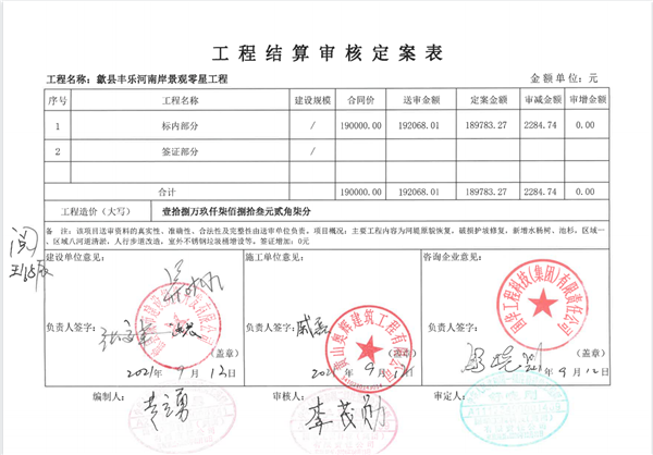 歙县丰乐河南岸滨水景观提升工程结算审核定案表