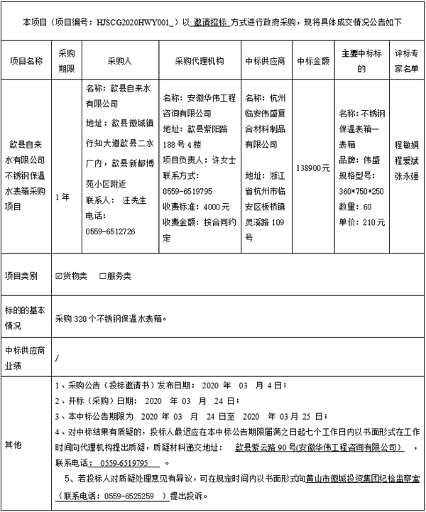 歙县自来水有限公司不锈钢保温水表箱采购项目中标公告