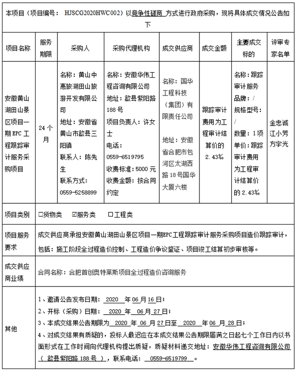 安徽黄山湖田山景区项目一期EPC工程跟踪审计服务采购项目成交结果公告