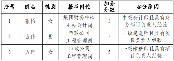 根据《乐鱼网页版招聘公告》(2020年7月23日)规定,“对报名参加主办会计岗位的考生如持有中级会计师及以上证书且具有财务部门负责人经验的(任职企业的注册资本需为1千万元及以上),给予总成绩3分的加分。对报名参加工程管理岗位的考生如持有一级建造师证书,给予总成绩2分的加分;如持有一级建造师证书且具有项目部负责人经验的(任职企业的注册资本需为1千万元及以上),给予总成绩5分的加分”。现对报考人员申请加分的审核工作已全部结束,经审核符合加分条件的人员共3人,现予以公示,接受社会监督。