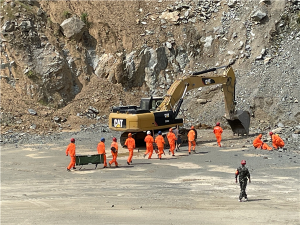 演练模拟了我县遭受连日暴雨,天气转晴后,挖掘机在采矿区进行清理装载作业,突遇矿山塌方事故,导致一名工作人员受伤被埋场景。陆壹零公司根据现场情况启动应急预案,从现场警戒,到救援被埋人员以及现场包扎处理的全过程,各演练小组均各司其责、分工协作、秩序井然,圆满完成了演练任务。