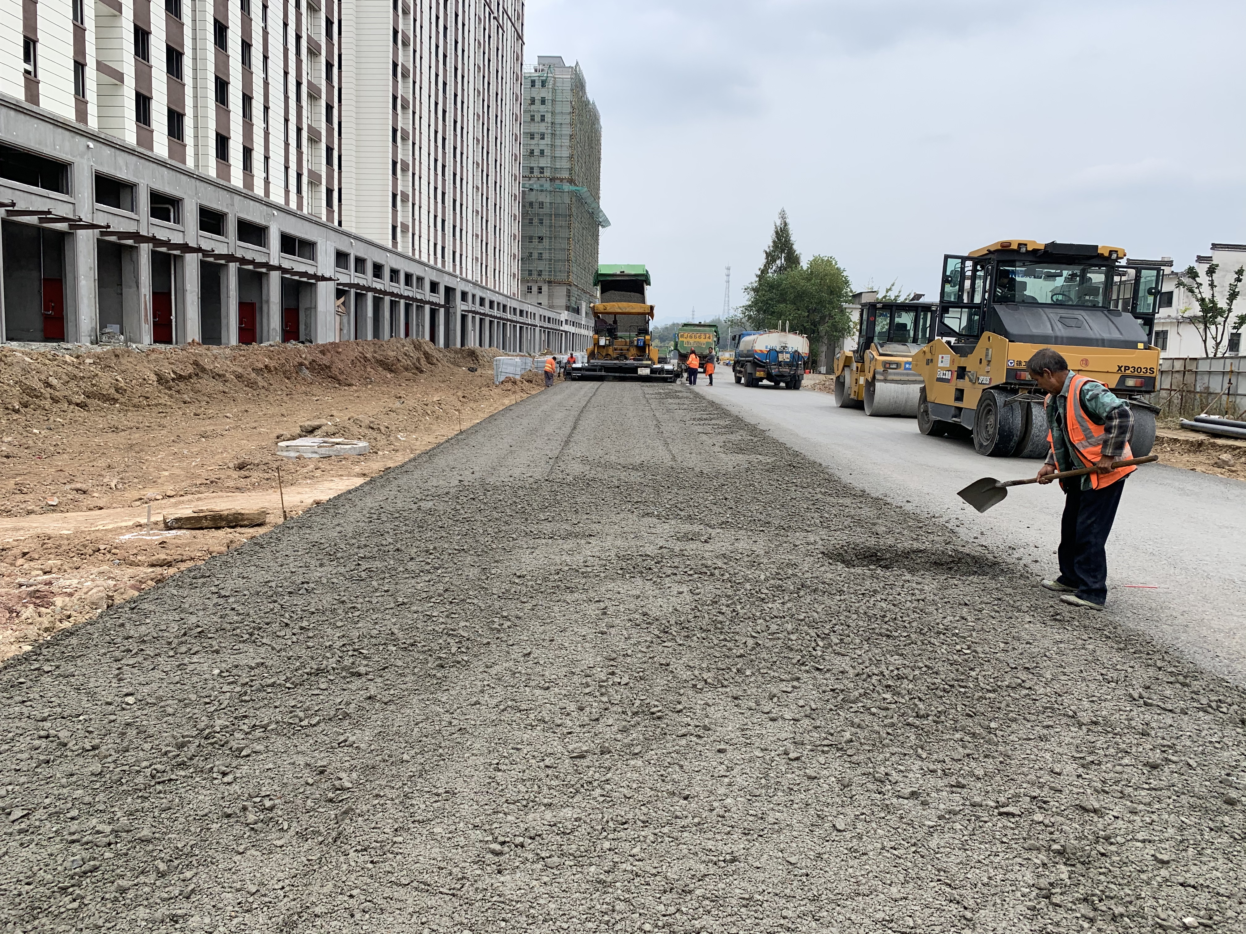 目前施工范围内箱涵、污水管道、强弱电管道施工完成,水稳摊铺铺设完成,正在养护。